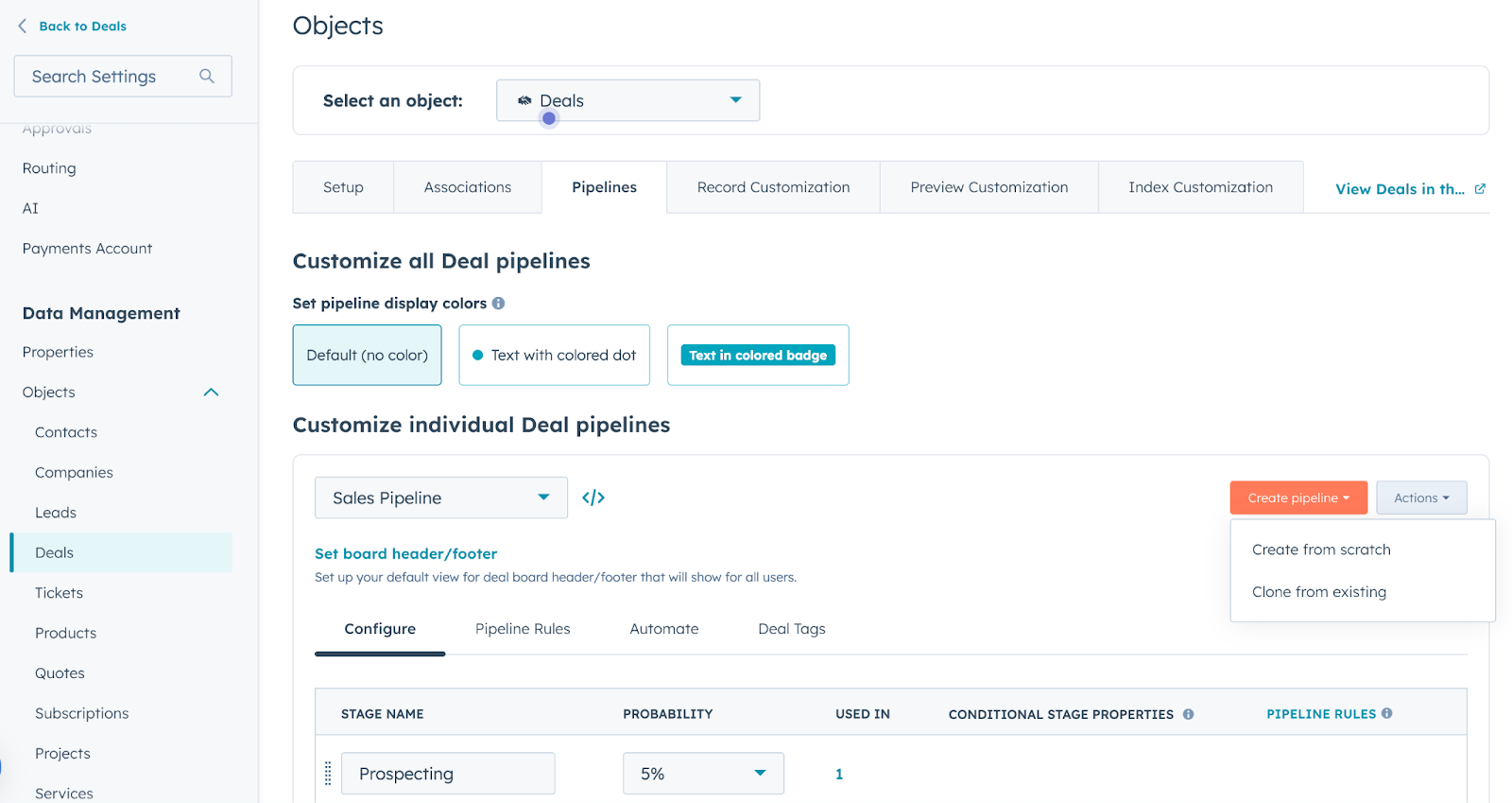 Once you've identified your stages, create the pipeline in HubSpot by heading to your settings and selecting Deals under Data Management. In here, you’ll see any existing pipelines you have and the option to create a new one by clicking the Create pipeline button.