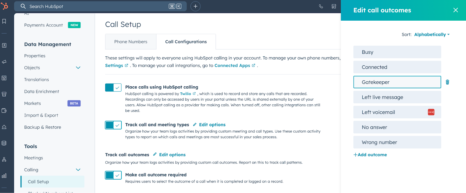 Here’s another tip to make your team’s calls even more effective: set custom call outcomes. In Settings, go to Call Setup, then Edit Options next to the call outcome setting. HubSpot will give you some default options: