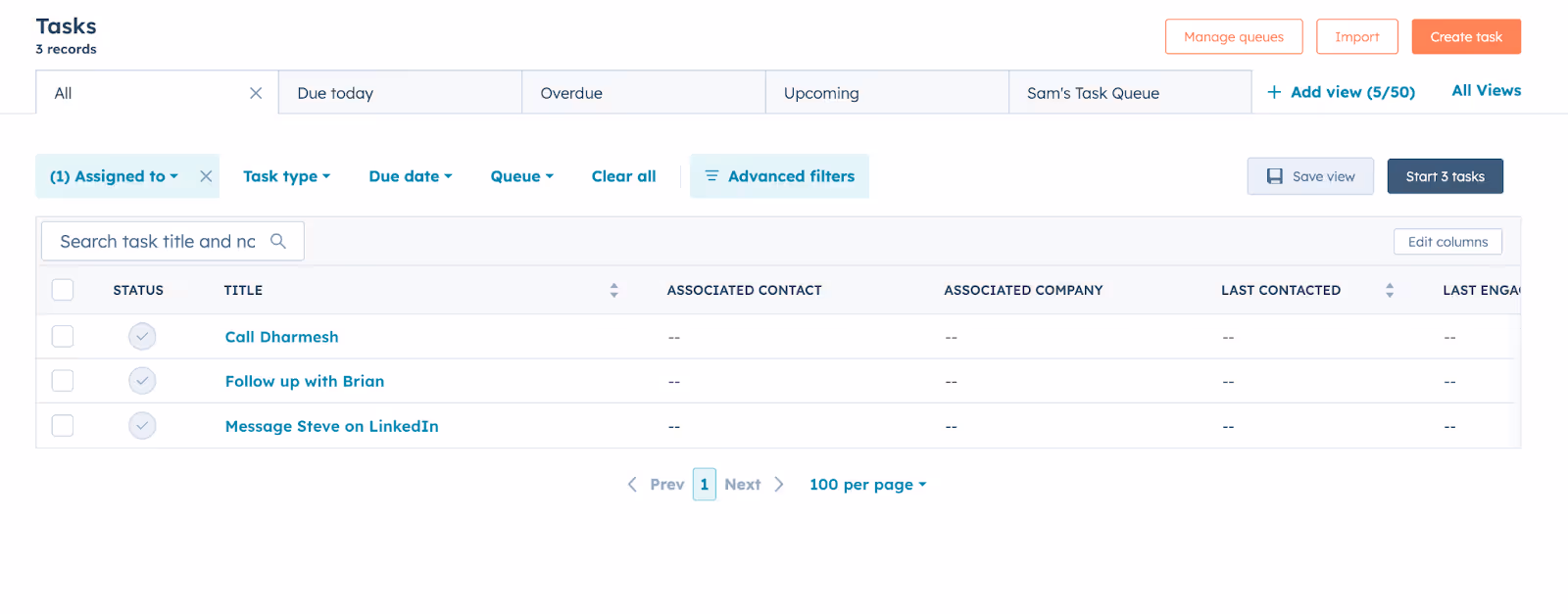 I recommend creating multiple task queues to separate tasks by their “theme” to reduce context-switching. For example, you could have a queue for prospecting tasks like calls and emails, or a queue for deal follow-up. I’ll cover this and a few more advanced task management tips next.