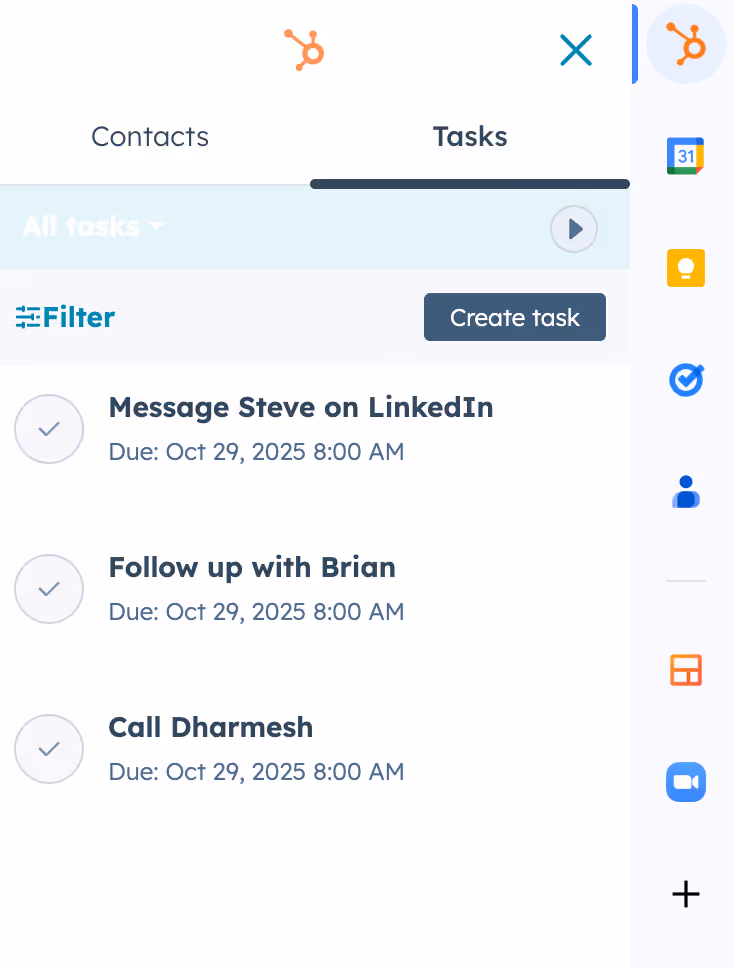 Finally, if you have the HubSpot Sales Chrome Extension installed, you can also create tasks from Gmail. Look for the sprocket (HubSpot logo) icon, click on the Tasks tab, enter the details for your task, and save.