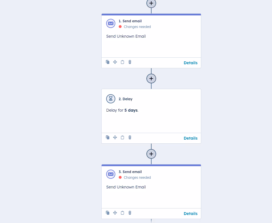 A simple sequence of 3-5 emails with a 3-5 days delay between each one is a great way to start your first workflows.