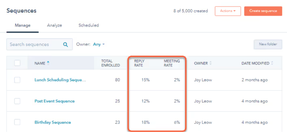 Sequences force you to standardize your outreach. From messaging to email cadence, you’ll engage with every prospect in the same way, giving you consistent data that you can analyze. Check out my favorite HubSpot sales dashboards to see how you can measure your effectiveness.