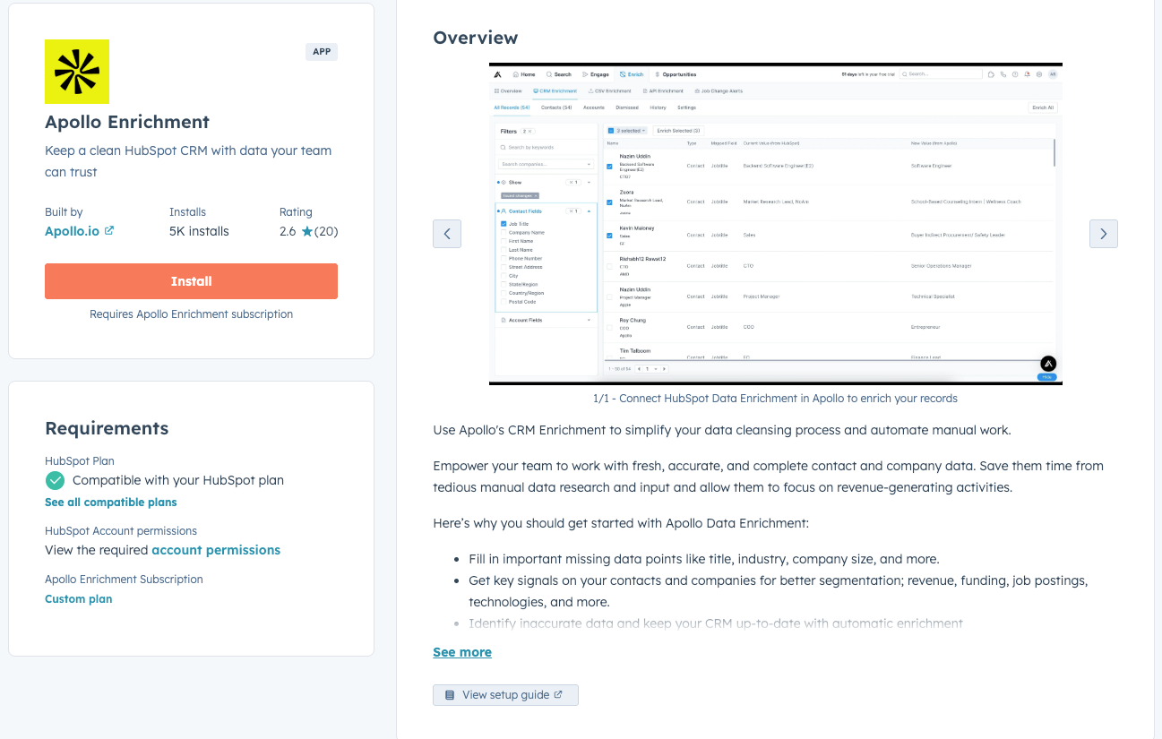 Be warned, though: the integration with HubSpot is not stellar. Apollo often duplicates companies rather than linking them, which can lead to a lot of bad data in HubSpot.