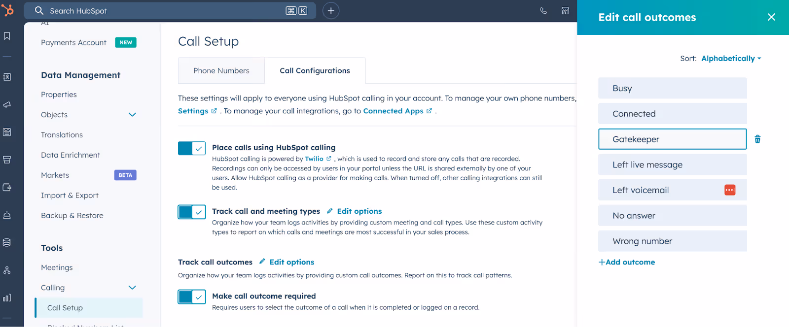 Here’s another tip to make your team’s calls even more effective: set custom call outcomes. In Settings, go to Call Setup, then Edit Options next to the call outcome setting. HubSpot will give you some default options:
