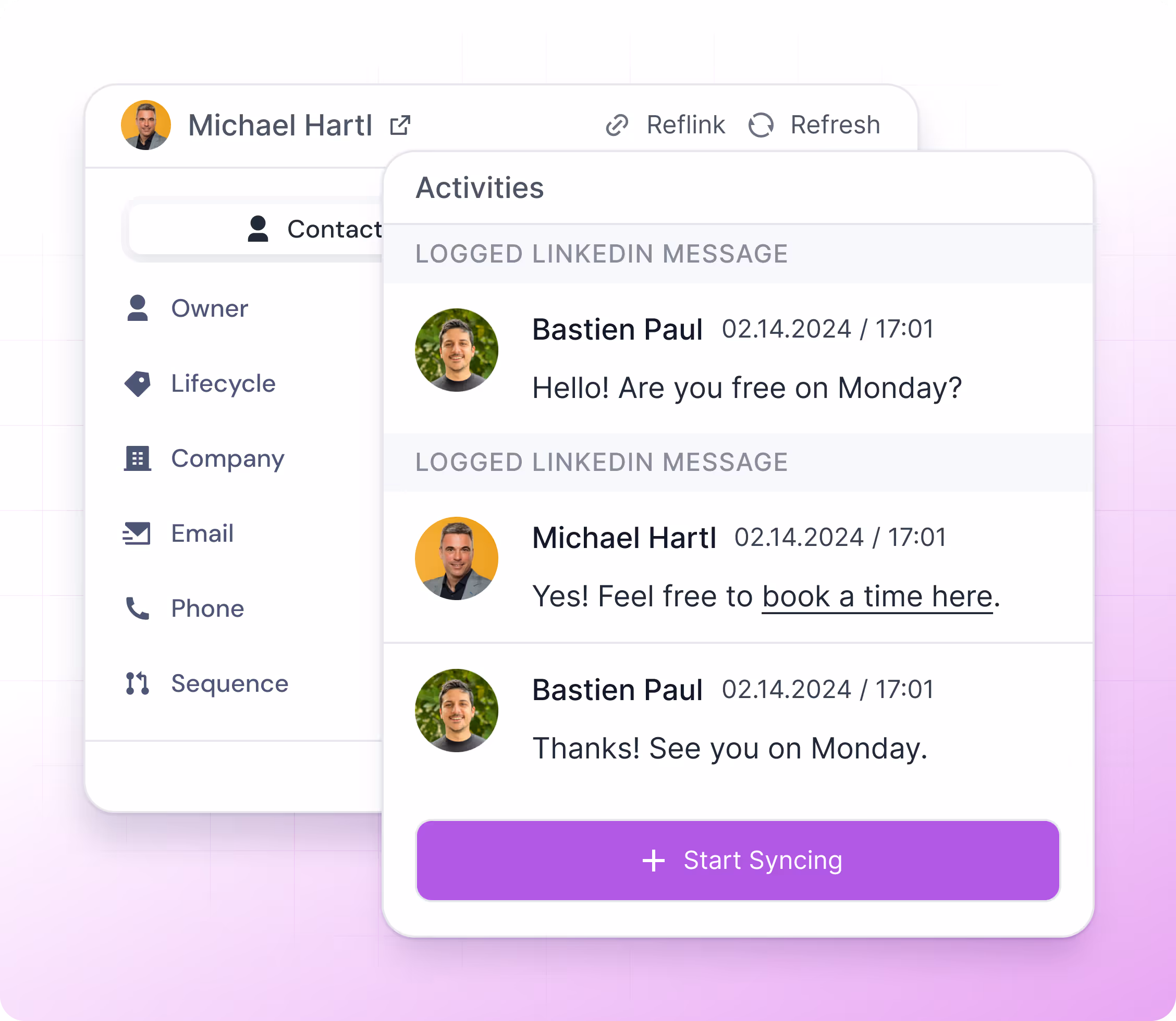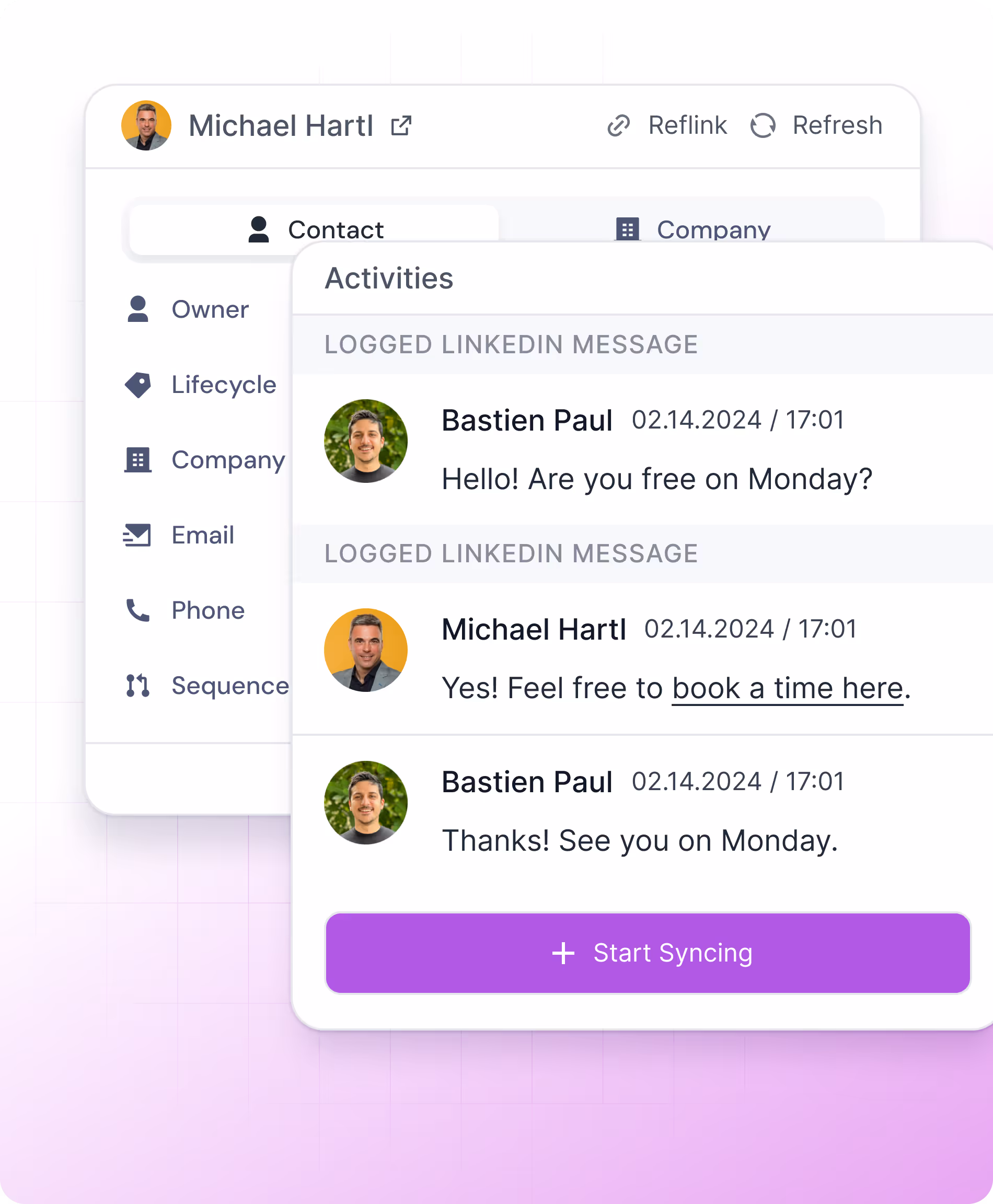 Every LinkedIn conversation, inMails too, gets logged in HubSpot, so you never lose a hot lead, reps maintain momentum, and your pipeline stays full.