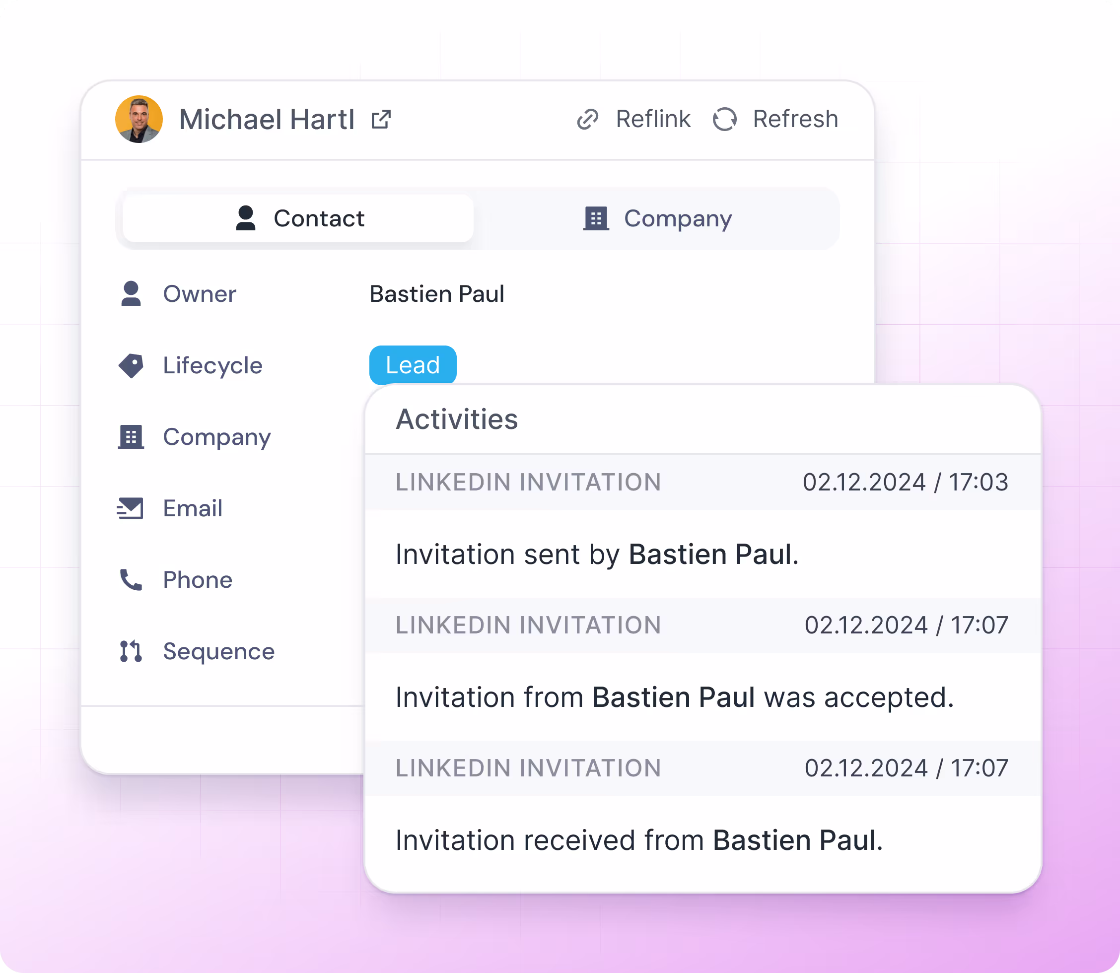 View and edit contacts & companies directly in LinkedIn. No switching to HubSpot or other tools; all updates and logs happen seamlessly in your flow.